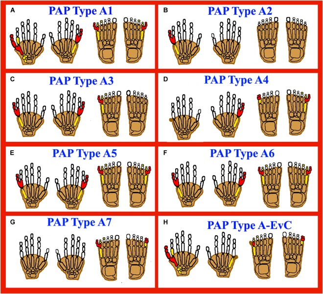 图 2:显示轴后多指畸形 (PAP) 类型 A(PAPA1-PAPA7 和 PAPA 类型 A-EVC)的 autopods 卡通图。红色填充元素表示受影响/多指的手指,黄色填充元素表示发育不良/发育不全的骨骼,阴影手指表示并指畸形。(A)代表 PAPA1,上肢和下肢都有发育良好的多指。(B)代表 PAPA2,多指仅限于上肢。(C) PAPA3,显示上肢和下肢都有发育良好的多指。(D) PAPA4,有发育良好的多指,PAPB 也有报道(皮赘无骨)。(E、F) PAPA5、6:发育良好的多指和脚趾。(G)代表 PAPA7,多指仅限于脚趾。(H)代表 PAP 类型 A-EVC,上肢和下肢均具有 PAP 类型 A 和 PAP 类型 B。