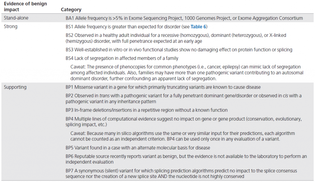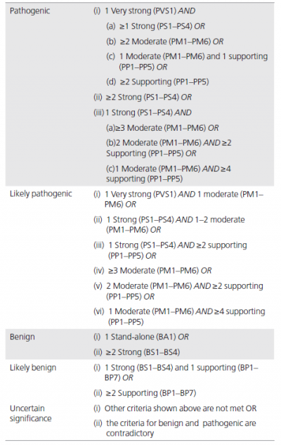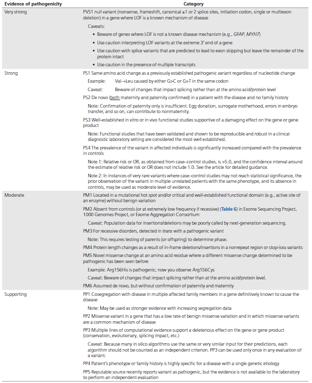 以下评估变异证据的方法是用了解释在临床诊断实验室中具有疑似遗传(主要指孟德尔遗传)疾病患者的变异。并不适用于解读体细胞变异、药物基因组(PGx)变异、或者是多基因非孟德尔复杂疾病相关的基因变异。在外显子组或基因组研究中,对候选基因(意义不明确的基因(GUS))应用这些准则时应当谨慎(见下面注意事项),因为本指南目的不是满足鉴定新致病基因的研究需求。
