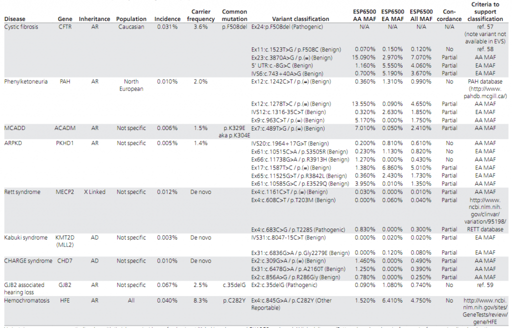 通过搜索公共人群数据库(如千人基因组数据库,NHLBI外显子测序数据库,EXAC数据库; 表1),并利用已发表文献中相同种族的对照数据进行基因变异频率分析(译者注: 此条款在指南更新时会有修改),通过分析变异基因在对照人群或普通人群中的携带频率,有助于评估该变异的潜在致病性。NHLBI外显子测序数据库来源于白种人和非裔美国人群,根据其数据覆盖量能够识别是否存在基因变异。尽管千人基因组数据库缺乏评估基因变异能力,但它囊括了更多的种族人群,因此其数据具有更广泛代表性的。EXAC数据库近期发布了一组来源于不同人群的6万多个外显子组的等位基因频率数据,包括了大约三分之二的NHLBI外显子测序数据。一般情况下,某一等位基因在对照人群的频率大于疾病预期人群(表6)时,可认为是罕见孟德尔疾病良性变异的强证据(BS1),如果频率超过5%时,则可认为是良性变异的独立证据(BA1)。此外,如果疾病发生在早期,且变异在健康成人中以隐性(纯合子)、显性(杂合子)或X-连锁(半合子)的状态存在,那么这就是良性变异的强证据(BS2)。如果数据库中未能检出变异的存在,应该确认建立该数据库采用的测序读长深度是否足以检测出该位点上的变异。如果在一个大样本的普通人群或队列数据的对照人群(>1000人)中变异不存在(或隐性遗传的突变频率是低频),并且携带此变异的患者与对照人群为同一种族,那么可以认为该变异是致病性的中等证据(PM2)。许多良性变异是“个体化的”(即个人或家系独有的),因此即使在相同种族的人群中缺乏也不能作为致病性的充足甚至强的证据。