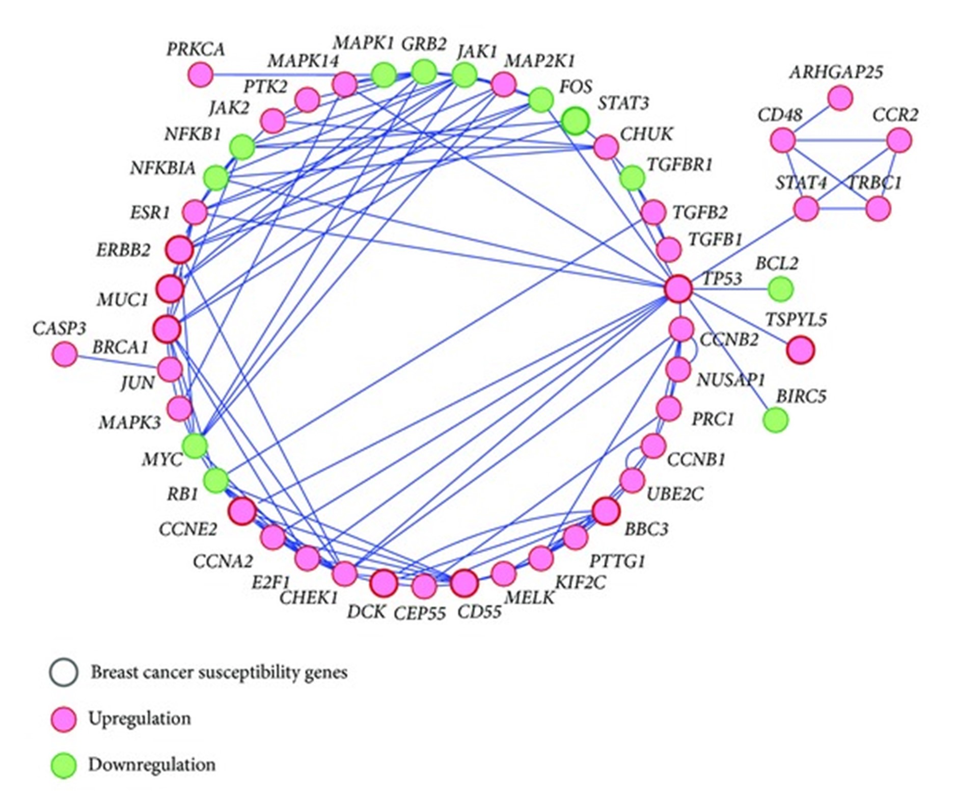 此外,Wang 等人的 netSAM 鉴定的排名前 50 的基因。数据集显示在图 3. 从图 3不仅鉴定了已知的乳腺癌转移基因(BRCA1、TP53和ERBB2),还鉴定了TSPYL5、CD55、CCNE2、DCK、BBC3和MUC1等新型癌症易感基因。这些公认的基因与许多其他基因相互作用,共同调节乳腺癌的进展和演变。节点大小与乳腺癌易感性有关,它代表了与癌症有关的基因的可能性。图 3是使用 Cytoscape 创建的。