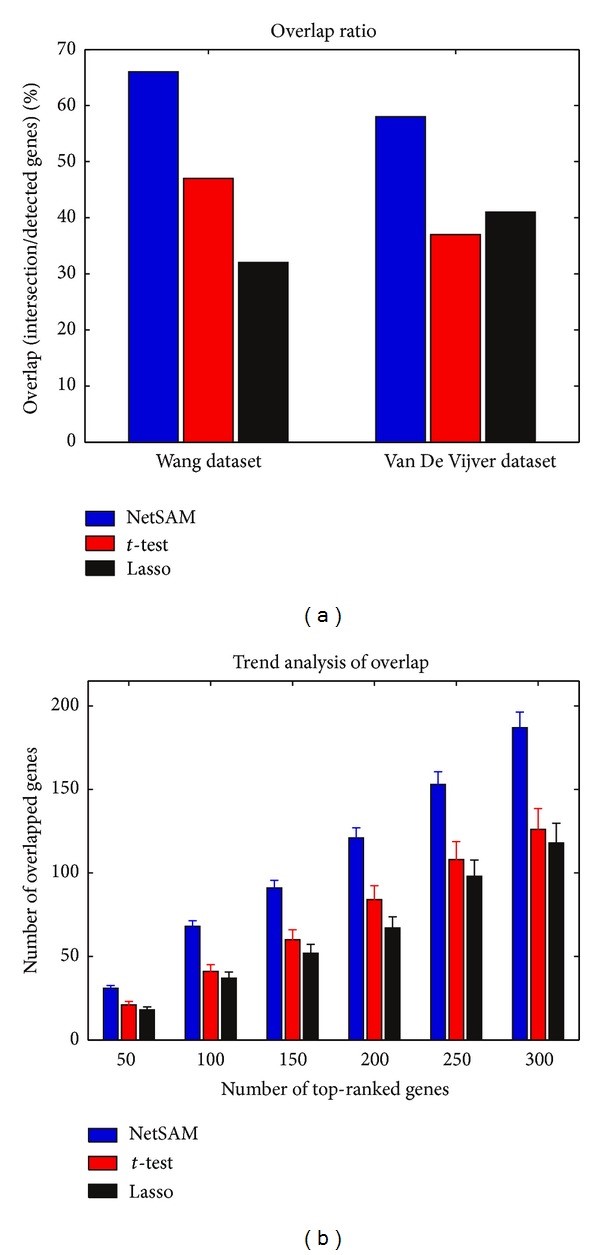为了验证netSAM的预测能力,进行了重叠率和重叠趋势分析。netSAM、t -test 和 lasso 之间的比较结果显示在图 4基于王等人。和 Van De Vijver 等人。乳腺癌数据集。重叠率的比较表明netSAM可以识别一些t检验和lasso没有发现的新型致癌基因。只有少数已知的乳腺癌基因通过t检验和 lasso 被正确识别。从图 4,与其他两种方法相比,netSAM可以识别更多的重叠基因,这表明netSAM在生物标志物识别方面在不同数据集之间获得了更好的重现性。此外,图 4还表明,由 netSAM 鉴定的一些候选基因(约 60%)与 BCGS 中已知的乳腺癌基因显着重叠。因此,鉴定癌症发生的致病基因和风险基因的信号网络分析团队可以得出结论,netSAM 是一种更有效的识别生物标志物的方法。