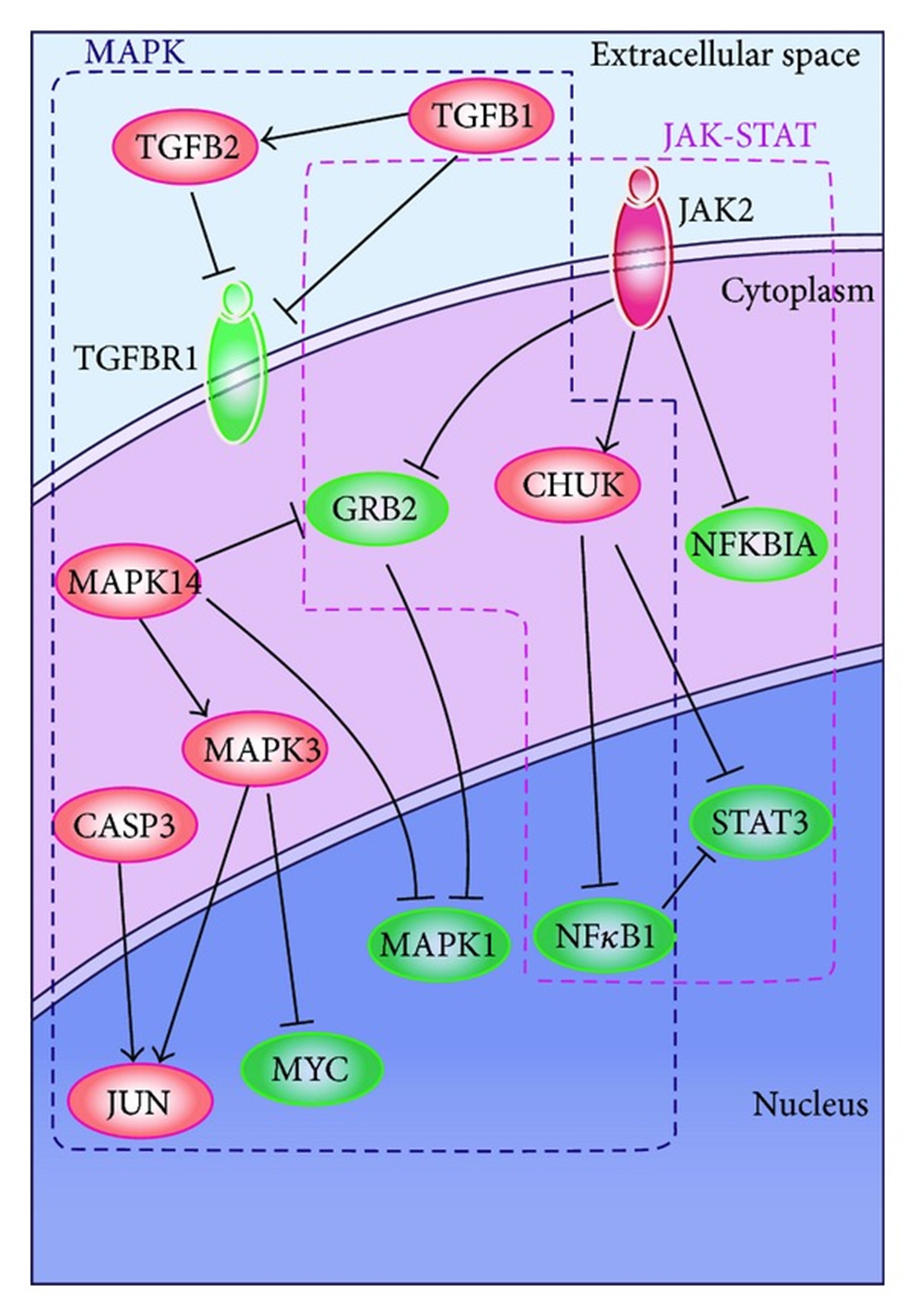 图中描绘的信号通路图 5包括 MAPK 和 JAK-STAT 信号通路,这些信号通路在 Wang 等人的 netSAM 方法鉴定的癌症相关遗传网络中突出显示。乳腺癌数据集。