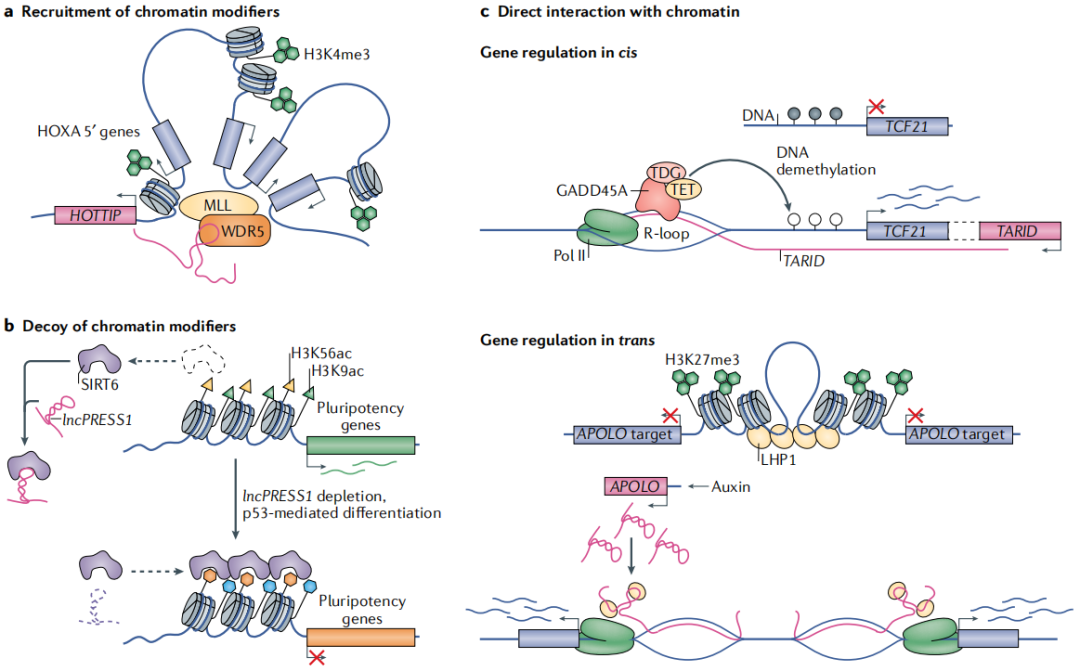 大多数lncRNA由RNA聚合酶II (Pol II) 转录产生,具有5'帽子结构和3' poly(A)尾巴结构,但是其加工剪接效率较低,并且呈现出明显的细胞核定位现象。定位在细胞核的lncRNA,可以与DNA、RNA、蛋白质等多种分子相互作用,调控染色体结构和功能;通过顺式(cis)或反式(trans)调控基因的转录,影响mRNA的剪接、稳定和翻译等。剪接加工有效的lncRNA转运至细胞质,在转录后水平反式调控基因表达(如调节mRNA翻译和降解等)。