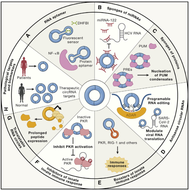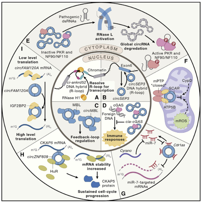 基因解码清晰地揭示出,circRNA可以充当miRNA和蛋白质的分子海绵、影响转录、干扰mRNA前体的正常剪接、调控mRNA分子翻译、形成环形RNA蛋白质复合体、与mRNA竞争性结合蛋白质等机制,参与免疫、代谢、神经系统发育和细胞增殖等生物学过程中。