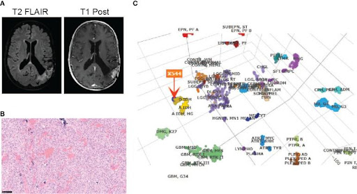 图 2:在最近一次肿瘤切除前通过(A) MRI诊断少突胶质细胞瘤、IDH 基因基因检测突变和 1p/19q 共缺失、CNS WHO 3 级;(B) H&E 染色 (20X) 和(C)最近肿瘤切除的肿瘤样本的 DNA 甲基化分析。