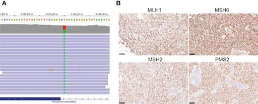 图 3:(A)先证者中发现 PMS2基因检测突变 (c.251-2A>T) ;(B)使用最近肿瘤切除的肿瘤样本对 MMR 蛋白进行免疫组织化学染色,包括 MLH1、MSH6、MSH2 和 PMS2 (20X)。