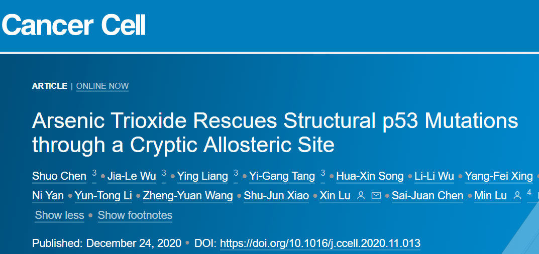 2020年12月24日,基因解码科学家实现了突破,在 Cancer Cell杂志上发表了文章 Arsenic Trioxide Rescues Structural p53 Mutations through a Cryptic Allosteric Site,提出了针对抑癌蛋白设计和寻找靶向药物的理论,并根据此理论,观察并解释老化合物三氧化二砷(ATO)可以恢复部分基因突变导致的P53蛋白缺陷,在国际上提出了根据抑癌蛋白肿瘤基因设计和选择靶向药物的方法和案例。