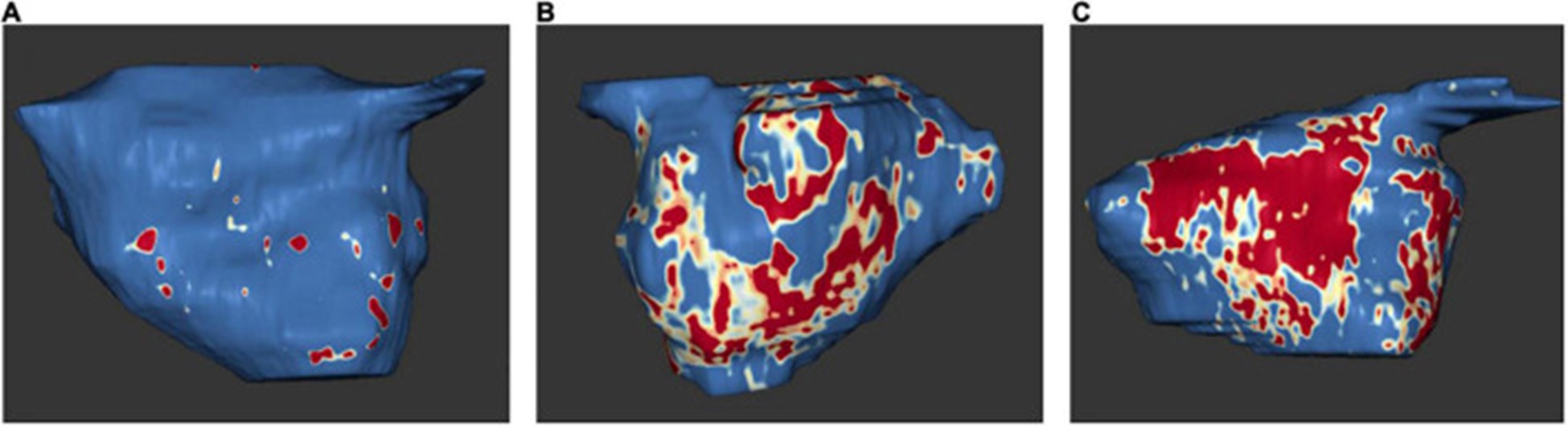LA 中高比例的低电压区域和纤维化区域预示着导管消融后 AF 的复发 ( 104 – 108 )。在多次消融的患者中,低电压区患者的 AF 复发率显着高于未消融的患者(36% vs. 6%,p < 0.001)(106)。纤维化区域的大小、LA 和右心房的纤维化以及降低的最大电压对消融结果有负面影响 。此外,LA 纤维化区域与更大的 LA 大小、降低的射血分数和更高的 C 反应蛋白水平显着相关 。