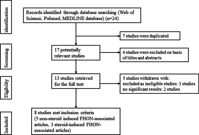 对于系统评价,从数据库中确定了 24 个研究。剔除不符合研究主题的研究后,剩下13个研究。另外三个研究被评为不合格的研究而被排除,因为它们提供的数据不足。排除了其他两个没有显着结果的研究。最后,选择了八个符合条件的研究数据,因为它们包括令人信服的数据、适当的定性评估、显着的结果、是对人的研究和符合股骨头坏死的基因解码基因检测重大课题研究组目的的主题(图 1)。 在 8个研究数据中,有 5 个非类固醇诱导的股骨头坏死的相关研究,包括 9 种基因突变; 3 个类固醇诱导的股骨头坏死相关研究,包括 4 种基因突变。所有研究都是回顾性研究,以确定股骨头坏死相关的基因突变基因检测。研究中包含的所有数据都使用血液样本对受试者特异性基因分型基因检测。