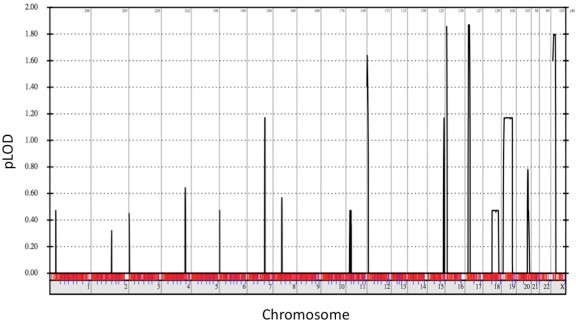 图 5:1 型远端关节挛缩症与染色体 17p 的联系。从 Affymetrix 10K 阵列数据构建的 1 型远端关节挛缩症家族的参数化多点 LOD(几率的对数)分数的全基因组概况。从 p 端(左)到 q 端(右)的人类染色体在水平轴上连接在一起。垂直轴显示了水平轴上指示的人类染色体上物理位置的参数 LOD 分数。1.86 的峰值 LOD (pLOD) 得分(定义最强的连锁区域)位于染色体 17p 内。