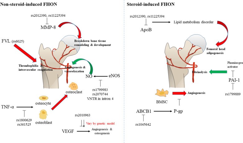 简而言之,非类固醇诱导的相关基因是MMP-8、TNF-α、eNOS、VEGF和因子V,类固醇诱导的相关基因是ApoB、ABCB1和PAI-1。股骨头坏死的总体基因机制如图 1 所示。
