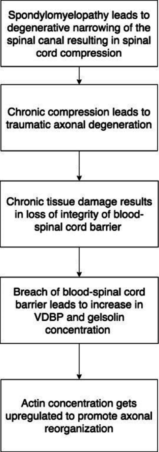 VDBP 和凝溶胶蛋白在脊柱脊髓病中的作用遵循一种有趣的机制,导致其上调。根据 Martin-Vaquero 等人的基因解码研究,发现犬模型在脑脊液中上调了 VDBP,表明血脊髓 (SC) 屏障出现了缺口(图1)。就功能而言,凝溶胶蛋白和VDBP在可以调节肌动蛋白的意义上是相似的。然而,当发生轴突变性时,肌动蛋白丝被释放,从而增加 VDBP 和凝溶胶蛋白的表达。因此,当因脊髓病而发生轴突损伤时,肌动蛋白浓度增加以促进肌动蛋白再生。这使得 VDBP 和凝溶胶蛋白成为 CSF 分析中有价值的蛋白质。