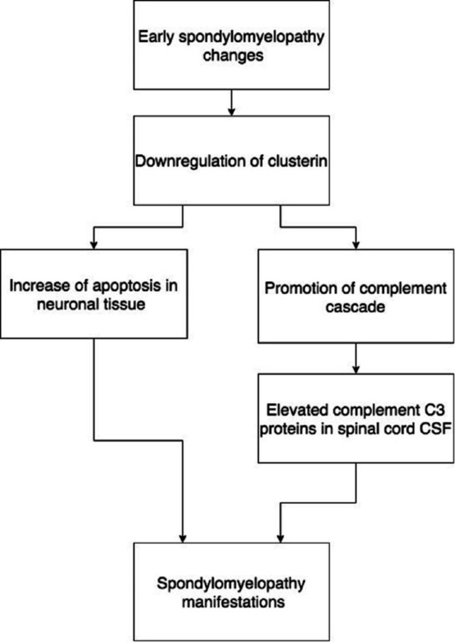 根据 Martin-Vaquero 等人的基因解码结果,载脂蛋白 E  和凝聚素在退行性脊髓病中被下调。表明用皮质类固醇治疗后蛋白质表达增加。下调的 载脂蛋白 E  将导致神经系统修复机制的丧失,并与脊髓病患者的手术结果较差有关。下调的凝聚素导致凋亡调节的丧失,因为神经元和少突胶质细胞的凋亡参与了脊椎脊髓病的发病机制。除了促进细胞凋亡外,补体级联在没有凝聚素调节的情况下上调,导致神经元组织破裂。这种关系与补体 C3 蛋白有关,因为低聚集蛋白会导致该病患者脑脊液中的 C3 升高(​​​图2)。