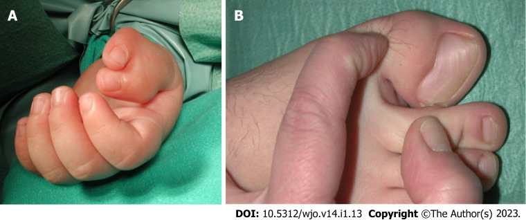 轴后多指畸形是一种常见的先天性手部畸形,其特征是手和/或脚的第五指重复(图2)。高加索人种的患病率估计为 1/630 至 1/3300,黑人的患病率估计为 1/100 至 1/300。根据《骨科疾病的基因检测》,轴后多指畸形存在两种表型类别:A 型,额外手指发育良好并与第五指或额外掌骨相连;B 型,存在不完整的额外第五指,通常以额外的皮赘为特征。两种类型均可通过常染色体显性或隐性遗传[ 22 ]。A 型轴后多指畸形有六个亚类。