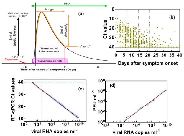 因此,考虑病毒诊断敏感性的一个基本问题与如何比较/关联从不同方案和病毒样本获得的 RT-PCR 中的循环阈值 (Ct) 值的问题 。这个练习仍然很复杂,因为只有了解患者的健康史才能正确解释 Ct 值 。在考虑 Ct 临界值和诊断敏感性时,构成传播风险的病毒载量范围的不确定性是另一个因素 。人们在症状出现时最具传染性(图1a),上呼吸道病毒载量最高的人群 。渐近个体遵循类似的动态,并以与症状前个体相同的方式对病毒传播做出贡献。普遍认为 Ct 值与 SARS-CoV-2 病毒载量有关,Ct 为 33-35 与低传染性有关,Ct 值 < 20 与高病毒载量有关,Ct = 40 为临界值在积极和消极识别的个体之间。最近,SARS-CoV-2 病毒颗粒高效检测方法重点攻关课题组中的一些人 [ 16 ] 使用来自 520 名 COVID-19 患者的数据证实了 SARS-CoV-2 RNA 的时间线(图1B)。与最高病毒载量相对应的最低 Ct 值在症状发作后早期记录,随后随着症状发作后时间的增加病毒载量下降。