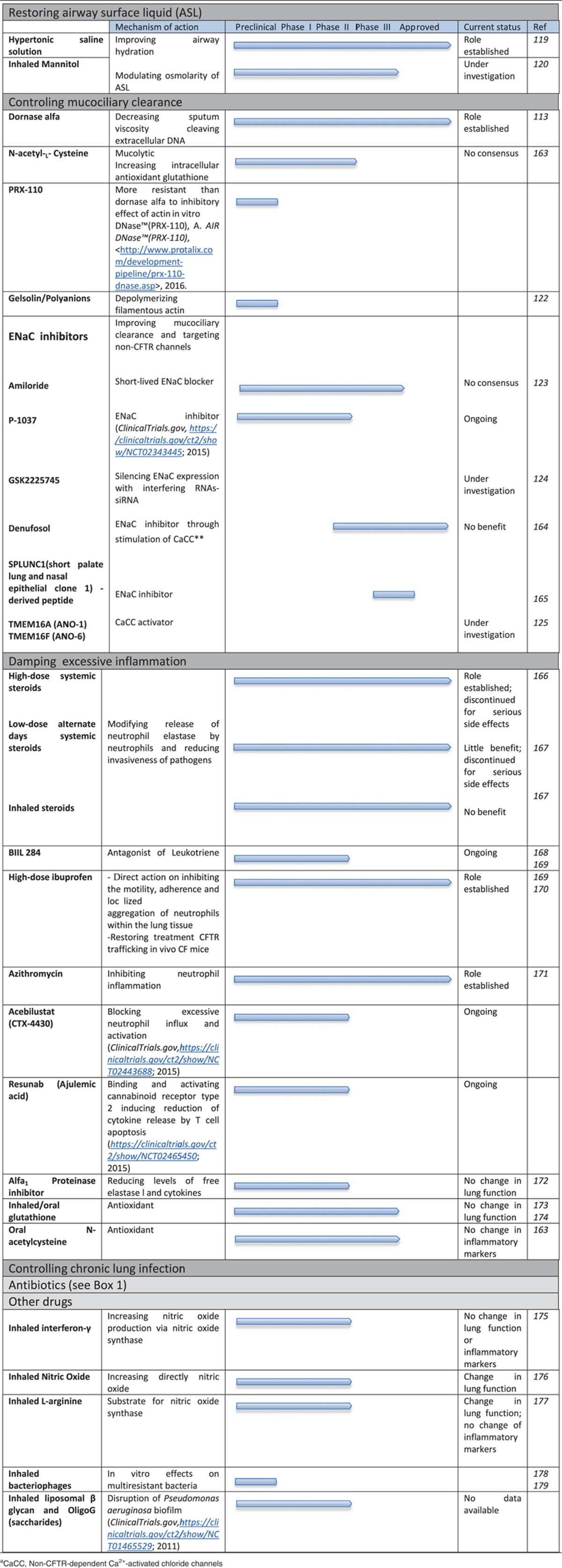 由于 CFTR 阴离子通道活性缺陷会导致气道表面液体 (ASL) 异常,因此使用气雾化粘液溶解剂和渗透剂治疗CF 肺部疾病。此外,减少上皮钠通道 (ENaC,介导 Na +吸收)过度活跃的化合物,从而纠正异常 ASL 并减少粘液厚度正在开发中。一种新的化学 ENaC 抑制剂 (P-1037) 正处于第 2 阶段(表1)。同样,一种封装在脂质纳米颗粒中的 ENaC 靶向寡核苷酸 (GSK2225745) 正在开发中。124为了恢复囊性纤维化(CF)气道中的水和电解质平衡,钙激活氯离子通道 (CaCC) anoctamin 1 (ANO-1,也称为 TMEM16A) 和外向整流氯离子通道 ANO-6 (TMEM16F) 的基本成分也正在成为靶向药物。另一种治疗选择是通过雾化碳酸氢盐或其他缓冲剂(如氨丁三醇)纠正囊性纤维化(CF)气道中的酸性 pH。最近,氨丁三醇单独使用或与高渗盐水 (7% NaCl) 联合使用已被证明可以增强囊性纤维化(CF)痰中的细菌杀灭效果。