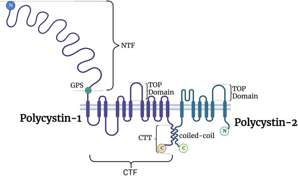 PC1 和 PC2 的结构。 PC1 和 PC2 通过它们的跨膜结构域和卷曲螺旋结构域相互作用。 PC1 在 GPS(G 蛋白水解位点)处被切割,产生 2 个保持束缚的片段:NTF(N 端片段)和 CTF(C 端片段)。 CTF 被进一步切割,产生 CTT(细胞质末端“尾巴”),基因解码发现它可以运输到细胞核和/或线粒体。 TOP,多囊蛋白结构域的四方开口,在多囊蛋白中是保守的,基因解码认为可以调节 PC2 活性。