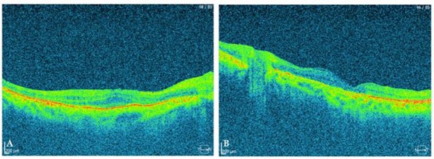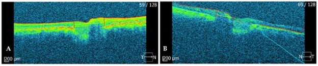 图1:( A ) 右眼黄斑的 SD-OCT 图像;( B ) 左眼黄斑的 SD-OCT 图像。