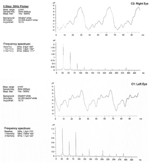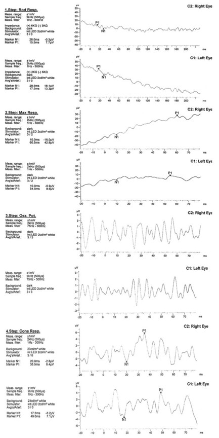 严重延迟隐性时间和暗视杆幅度降低、明视控制和闪烁反应(图 4)