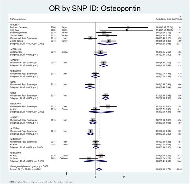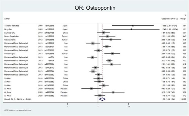 以下被评估的基因是骨桥蛋白。骨桥蛋白是一种多功能糖基化磷蛋白。许多人类和动物研究已经提出这种基因多态性是肾结石形成的一个因素。山手等人研究了骨桥蛋白在遗传性肾结石病例中的作用。他们发现在肾结石病例中显着检测到 GD1126616 (OR:13.86; 95% CI: 2.87–67.04) 。高等人评估了骨桥蛋白多态性对 76 例尿石症患者的作用。他们发现肾结石患者与健康患者相比,GD1126616 变异存在显着差异(OR:12.48;95% CI:1.5-103.54)。Gogebakan 等人对肾结石患者的骨桥蛋白多态性进行了另一项研究。他们的结果揭示了 GD1126616 多态性在肾结石发展中的作用(OR:2.01;95%;CI = 1.08-2.72)。