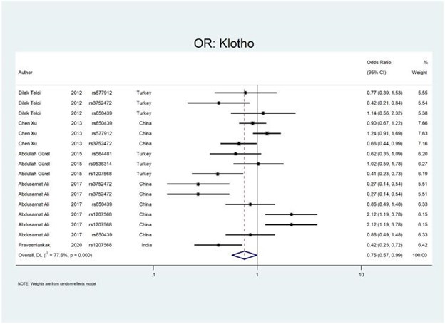 尿结石及肾结石的基因检测预测有效性研究团队的分析表明,Klotho 对感兴趣的结果具有保护作用(OR = OR = 0.75;95% CI:0.57-0.99)。所有关于这个基因的研究都是在亚洲国家进行的,所以尿结石及肾结石的基因检测预测有效性研究团队没有按大陆进行亚组分析。根据图 9,仅在 GD3752472 中观察到显着的保护优势比(OR = 0.58;95% CI:0.39-0.86)。