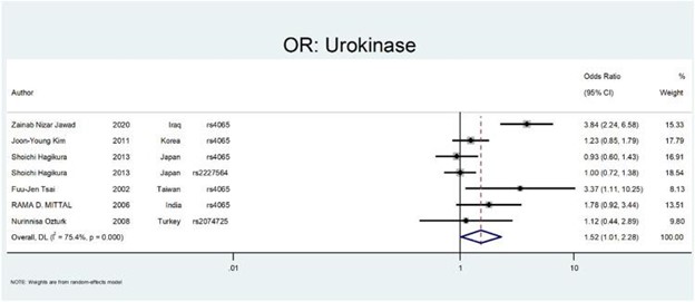 图 12,13描述尿激酶基因多态性的荟萃分析。总体优势比在统计学上不显着(OR = 1.52;95%CI:1.02–2.28)。在 GD4065 的 SNP 亚组中也发现了显着的关联(OR = 1.79;95% CI:1.04-3.11),但其他 SNP 亚组中的值无统计学意义(GD2227564,OR = 1;95% CI:0.72-1.38 ) 和 (GD2074725,OR = 1.12;95%CI:0.44–2.89)。