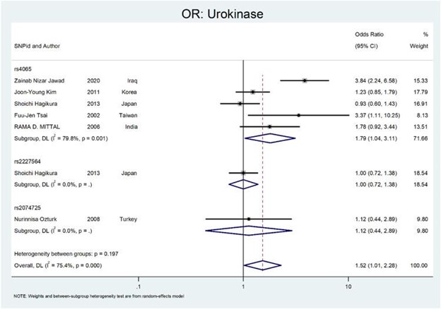 图 13:森林图:按 SNP 亚组对尿激酶进行 OR 亚组分析。