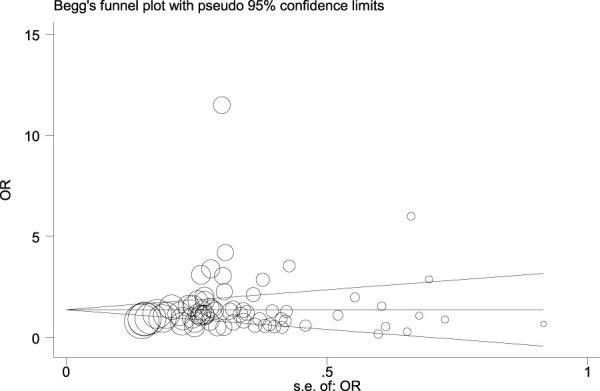 图 2显示 VDR 的 OR 的汇总估计值约为 1.20 (95%CI:1.06–1.36),揭示了两个研究组之间的显着差异。在图 3和图 4,该基因的亚组分析显示在亚洲患者中存在显着相关性,总体 OR 为 1.24(95% CI:1.08-1.42)。然而,欧洲和北美研究亚组的估计 OR 不显着(OR = 0.99;95% CI:0.75–1.32,OR = 1.56;95% CI:0.48–5.10)。在 SNP 亚组中,GD2228570 的 OR 的总体估计值显示出显着的关系(OR = 1.28;95% CI:1.01-1.62)。其他 SNP 的结果,包括 GD1544410(OR = 1.14;95% CI:0.9–1.43)、GD731236(OR = 1.3;95% CI:0.99–1.70 和 GD7975232(OR = 1.04;95% CI:0.83–1.31) ) 显示微不足道的值。