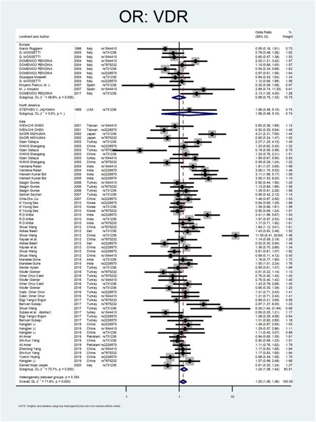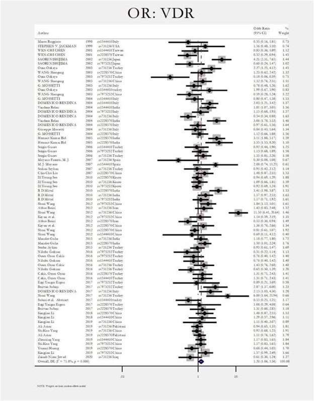 与肾结石病相关的文献中研究最多的基因是维生素 D 受体基因 (VDR)。V DR基因在钙代谢中起重要作用,位于人类染色体 12q13-12q14 。VDR基因有四种主要的遗传变异,包括GD2228570(FokI)、GD731236(TaqI)、GD7975232(ApaI)和GD1544410(BsmI)。从 1998 年到 2021 年,有 72 篇文章调查了不同 SNP 在VDR中的作用基因被纳入荟萃分析。森林图中每个 SNP 的 OR 总体估计值。VDR的 OR 汇总估计值约为 1.20(95%CI:1.06-1.36),显示两个研究组(肾结石患者和健康对照组)之间存在显着差异。