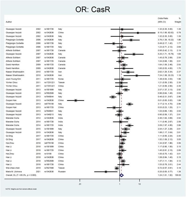 表格1显示了与基因及其 SNP 在高加索亚群中的影响相关的 OR 结果。这个种族在土耳其、加拿大和意大利被发现。意大利和加拿大的两项研究显示 SNP 亚组 GD1801726 (OR = 0.49; 95%; CI: 0.17–1.42) 和 (OR = 0.95; 95% CI: 0.42–2.13) 对 CASR 具有保护性 OR,而之前的一项研究在意大利,将该 SNP 确定为风险因素(OR = 1.32;95%;CI:0.35–5.00)。在三项不同研究中评估的另一项 SNP 是 GD1801725(OR = 1.23;95% CI:0.71–2.12,OR = 1.04;95% CI:0.68–1.58,和 OR = 1.64;95% CI:1.09–2.46)。估计值仅在 Hamilton 等人的研究中显着。(OR:1.64;95%;CI:1.09–2.46)。此外,加拿大对 GD1042636 的研究显示 OR = 1.45 的值不显着;95%;CI:0.78–2.69 和 OR = 1.60;95%;置信区间:0.53–4.83,而该值在意大利的一项研究中非常显着 OR = 5.20;95% CI:1.71–15.79。