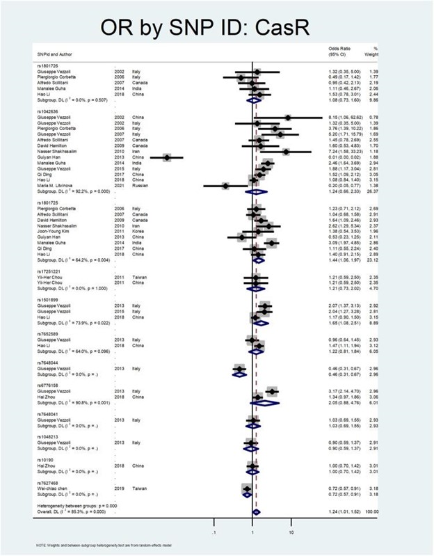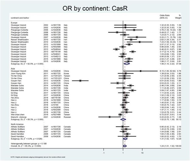 在尿结石及肾结石的基因检测预测有效性研究团队的荟萃分析中,对CASR基因 OR 的总体估计显示与结石形成显着相关(OR = 1.24;95% CI:1.01-1.52)。在按大洲进行的亚组分析中,OR 仅在欧洲和北美患者中具有统计学意义(OR = 1.56;95% CI:1.10-2.22,OR = 1.31;95% CI:1.02-1.67)。关于 SNP 亚组,GD1801725 和 GD1501899 是尿石症的危险因素,OR 值分别为 1.44 (95% CI: 1.06–1.97) 1.65 (95% CI: 1.08–2.51)。