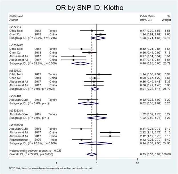图 8显示了具有保护作用的 Klotho 基因的 OR 汇总估计值(OR = 0.75;95% CI:0.57-0.99)。所有关于该基因的研究都是在亚洲国家进行的,不可能按大陆进行亚组分析。根据图 9,在 GD3752472 中观察到显着的保护优势比(OR = 0.4;95% CI:0.25-0.65)。其他 SNP 亚组的估计 OR,包括 GD1207568(OR = 0.94;95% CI:0.37–2.35)、GD650439(OR = 0.91;95% CI:0.72–1.14)、GD577912(OR = 1.08;95% CI:0.71–1.65) ), GD9536314 (OR = 1.02; 95% CI: 0.59–1.78), GD564481 (OR = 0.62; 95% CI: 0.35–1.09) 不显着。