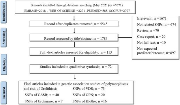在不同数据库共检索到的 7671 篇文章中,156 篇文章包括VDR基因多态性(n = 72)、CASR(n = 40)、骨桥蛋白(OPN)(n = 20)、尿激酶(n = 7)和Klotho基因 (n = 16) 符合系统评价的条件。荟萃分析纳入了 72 篇文章,以估计肾结石病例与对照组基因表达的总体优势比 (OR)。图1)。每个基因的 OR 的一般估计值以森林图表示,然后按大陆和 SNP 亚组进行亚组分析。本次荟萃分析中I平方的观测值高于50%,故采用随机效应法进行分析。流程图一描述了尿结石及肾结石的基因检测预测有效性研究团队论文的摘要。