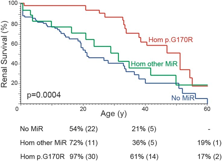为了比较AGXT基因型与 原发性高草酸尿症1型(PH1) 表型,我们通过突变类型的组合来表征患者,定义为截短、非截短或 MiR(p.G41R、p.F152I、p.G170R、p.I244T),并假设非截短/ MiR 突变可能仍有一些残留功能。具有两个 MiR 突变的患者出现症状较晚,进展为 ESRD 的速度较慢,并且草酸盐和乙醇酸盐水平低于任何其他基因型的患者(图 2B,补充表 1 ,表3). 这些结果与 p.G170R 25的先前发现一致,并突出了这些等位基因的不完全外显率/可变表达性。当排除 MiR 突变时,具有两个截短或两个非截短突变的患者之间的表型没有显着差异(补充图 3,补充表 2),这表明非 MiR、非截短等位基因通常完全失活。然而,我们确实注意到与那些没有 MiR 等位基因的杂合子相比,那些具有 MiR 等位基因的杂合子具有肾脏生存益处,如先前报道的 p.G170R(图 2B). 25这种较温和的表型也可以通过较低的尿液乙醇酸盐水平来证明,但不能通过其他尿液化学、发病年龄或肾钙质沉着症的发生率来证明(表3). 为了评估是否所有 MiR 等位基因在表型方面表现相似,我们将 p.G170R 与其他 MiR 等位基因(p.G41R、p.F152I、p.I244T)分开。Kaplan-Meier 肾生存曲线显示只有 p.G170R 纯合子的疾病较轻,其他 MiR 等位基因纯合的患者则不然(图 3). p.G170R 的生存优势仍然存在,尽管显着性下降,即使在肾衰竭前调整吡哆醇治疗后也是如此(图 3); 这发生在 53% 的 p.G170R 纯合子、26% 的其他 MiR 纯合子和 38% 没有 MiR 等位基因的患者中。接受治疗的患者比例在各组之间没有显着差异(P = 0.14)。因此,尽管所有 MiR 等位基因都揭示了功能性 MTS,但它们的外显率存在显着差异。29