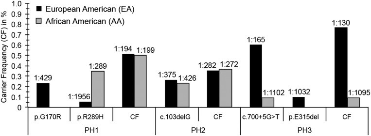 这项研究最重要的发现是,从人口数据中计算出的总体携带者频率(大约 1:70)和推断患病率(大约 1:58,000)比临床研究的估计值大一个数量级。因为这些新的估计来自对已知突变等位基因的计数,并且主要由一些常见等位基因驱动,所以这项研究不太可能高估载体频率。原发性高草酸尿症1型(PH1) 患病率的估计值大约是先前估计值的两倍,但 原发性高草酸尿症3型(PH3)的差异更为显着,其观察到的人群携带频率高于 原发性高草酸尿症1型(PH1),但在目前确定的临床人群中常见率低 6 倍。原发性高草酸尿症2型(PH2) 的人群携带频率是 原发性高草酸尿症1型(PH1) 的一半,但在临床人群中的频率要低 7 倍以上。HOGA1 c.700+5G>T突变(图 4). 有趣的是,AGXT p.G170R 仅在 EA 中发现,而AGXT MTS 变体(p.P11L、p.I340M、次要单倍型)在 AA 中比 EA 中少得多(图 4)。这一发现表明,预测错误定位 AGT 的突变在 AAs 中通常可能保持无症状,因为 MTS 需要存在次要单倍型才能激活。有趣的是,由于最常见的 AA 突变AGXT p.R289H(在 PHMD 中报告22),EA 和 AA 之间的 原发性高草酸尿症1型(PH1) 流行率仍然相似。该变异比任何原发性高草酸尿症等位基因(不包括 EA:HOGA1 c.700+5G>T)明显更常见(图 4) 并且得分很低,40质疑其真正的致病性质。去除该等位基因将使 原发性高草酸尿症1型(PH1) 患病率降低 48%(CF,1:270;患病率,1:291,256),PH 总体患病率降低 18%(CF,1:79;患病率,1:71,333,补充表 9 )。此外,AA 中的 原发性高草酸尿症1型(PH1) 患病率将降低 87%(CF,1:549;患病率,1:1,203,908),AA 人群中的原发性高草酸尿症总体患病率将降低 56%(CF,1:156;患病率,1:225,971)。因此,PH 在 AA 中的流行率比在 EA 中低约 82%。