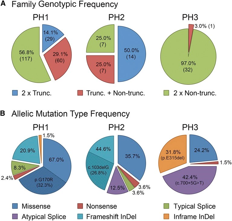 不同基因之间的基因型和等位基因分解差异很大(图1). 例如,50.0% 的 原发性高草酸尿症2型(PH2) 谱系包含两个截短突变,这是一种等位基因组合,仅占原发性高草酸尿症1型(PH1) 基因型的少数(14.1%),而在原发性高草酸尿症3型(PH3)中不存在(图 1A). G***R更容易发生移码插入缺失(插入、复制、缺失或插入+缺失),占所有突变等位基因的 44.6%,而大多数A**T突变是错义 (67.0%)(图 1B). 这些富集是由常见的突变驱动的;在 50.5% 的 原发性高草酸尿症1型(PH1) 家族中发现了 A**T 错误定位变化 p.G170R,在35.7%的原发性高草酸尿症2型(PH2) 家族中发现了G***R c.103delG。H**A1 的两个最常见等位基因(c.700+5G>T 和 p.E315del)表现出相当低的等位基因异质性,占总数的 74.2%(图 1B).