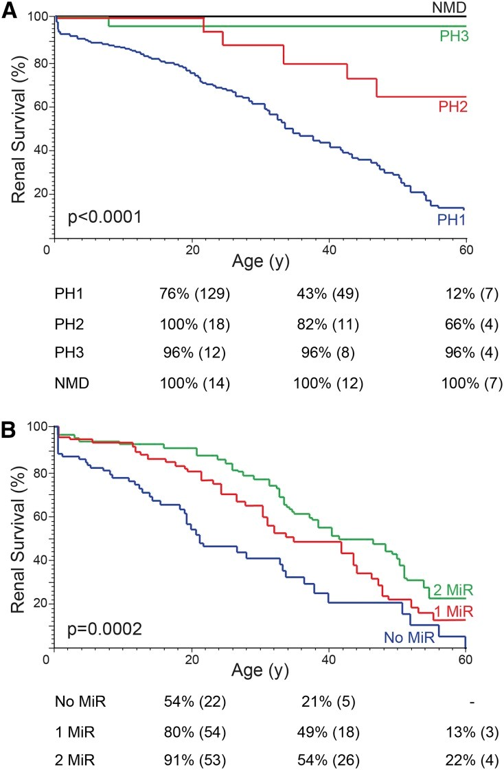 图2:肾脏存活图显示 (A) 原发性高草酸尿症1型(PH1) 患者的肾脏存活率较差,然后是 原发性高草酸尿症2型(PH2),和 (B) 具有两个 MiR 等位基因的 原发性高草酸尿症1型(PH1) 患者的肾脏存活率较好。(A) 原发性高草酸尿症1型(PH1)、原发性高草酸尿症2型(PH2)、原发性高草酸尿症3型(PH3)和 NMD 队列的 Kaplan-Meier 肾脏存活图。(B) 原发性高草酸尿症1型(PH1) 患者的 Kaplan-Meier 肾脏存活图被归类为具有两个 MiR 等位基因(纯合子或复合杂合子;AGXT p.G41R、p.F152I、p.G170R、p.I244T,89 名患者),一个 MiR 等位基因在与非 MiR 等位基因(97 名患者)或两个均不是 MiR 等位基因的等位基因(无 MiR,81 名患者)组合。Kaplan-Meier 图下方的表格显示了生存估计值,括号中为处于风险中的患者数量。