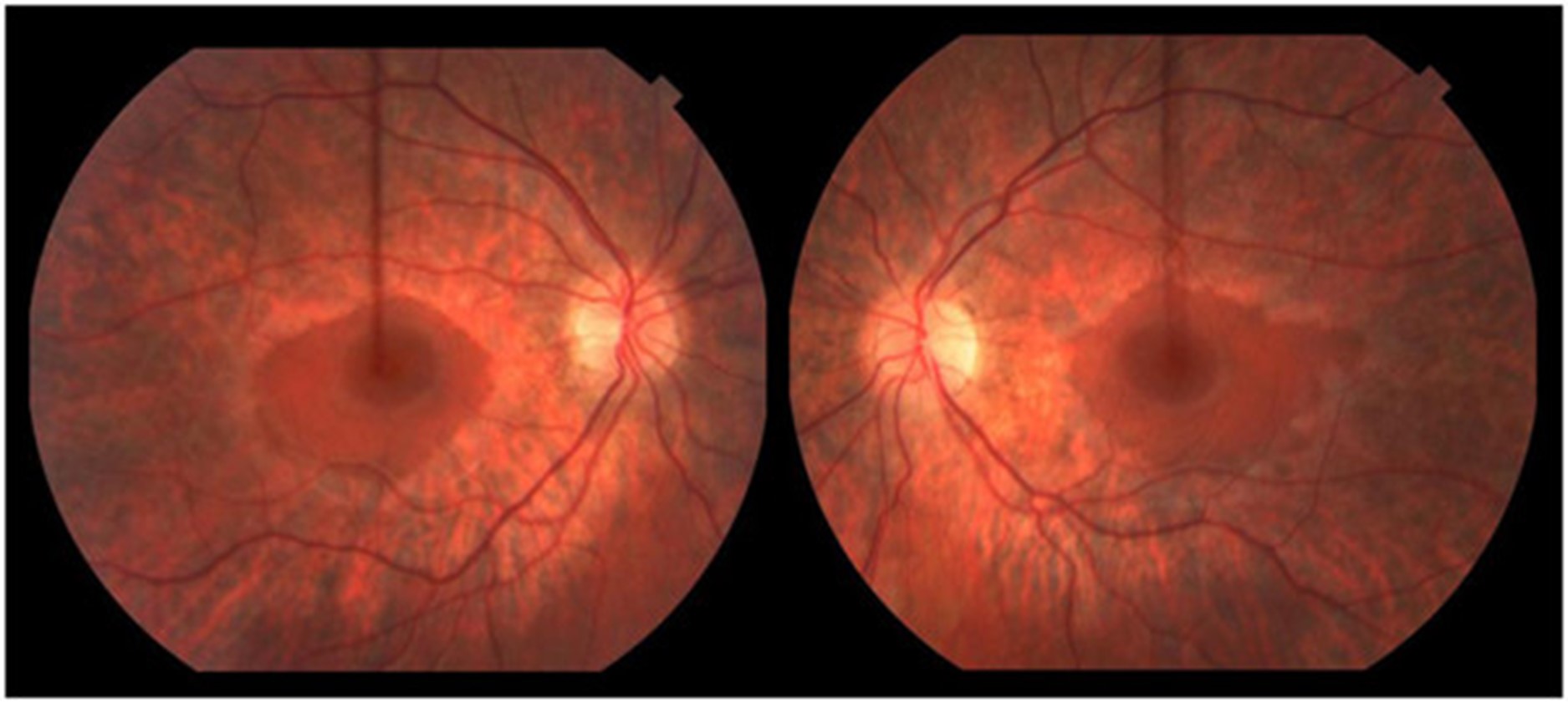 一名 16.5 岁的男孩在 3.5 岁时被诊断出语言表达迟缓和发音困难,这是由中度至重度感音神经性听力障碍引起的。他的语言发展在助听器的帮助下完全正常化。他早期的粗大和精细运动发育正常;他小时候会滑冰和打曲棍球。他在普通课堂环境中的学业成绩很好。11 岁时,他患上了隐匿的进行性步态共济失调。他被发现有双侧高弓足和轻度槌状趾足畸形、弥漫性反射消失和屈肌足底反应。注意到前间室肌肉非常轻度无力,因此使用了踝足矫形器。小纤维感官测试在库存分布中略有下降。振动觉和本体感觉保持完好。有明显的轻度不协调;快速手指运动缓慢,脚跟到胫骨测试受损。Romberg征阴性。神经传导研究(表1) 显示具有脱髓鞘特征的轻度感觉运动性多发性神经病(运动传导速度;20–25 m/sec;正常上肢≥50 m/sec,下肢≥40 m/sec)。感觉和运动神经振幅正常,但腓总神经 CMAP 振幅较低。随着时间的推移,他的高弓足恶化,他的神经传导研究显示进行性脱髓鞘(潜伏期延长增加)和长度依赖性轴突丧失(运动和感觉振幅进行性丧失)的证据。15.5 岁时的眼底镜检查显示广泛的周边视网膜萎缩伴中央黄斑(即严重的视杆细胞功能障碍伴视锥细胞相对保留)与色素性视网膜炎一致(图 1)。视力正常。视觉诱发电位正常。暗视杆状视网膜电图 (ERG) 显示轻度异常,表明周边视网膜的杆状细胞功能障碍。明视锥和 30 Hz 闪烁也异常,表明视锥功能障碍。在他 16.5 岁时的最后一次临床随访中,他在家中可以进行短距离走动,但由于他严重的共济失调,长距离走动需要轮椅。他没有表现出生长或青春期延迟的迹象。他的身高在 10-25百分位之间,并且在 16 岁时,他被注意到具有与年龄相适应的青春期发育;Tanner IV 阴毛和 12-15 mL 睾丸体积。他的认知、语言和视觉都完好无损。他没有肾脏或肝脏受累的临床或生化证据。