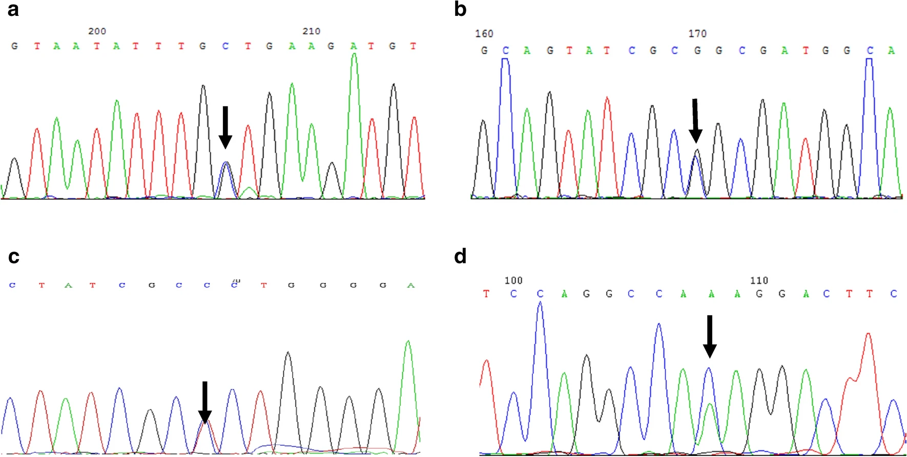 8 个家系中 BCKDHA 和 BCKDHB 基因中 4 个新变异的基因序列:BCKDHA 基因中的 c.841G>C(p.Gly281Arg) (a)、BCKDHB 基因中的 c.284G>C(p.Gly95Ala) (b)、c BCKDHB 基因(c)中的.511T>C(p.Ser171Pro),BCKDHB 基因(d)中的c.665A>C(p.Lys222Thr)。