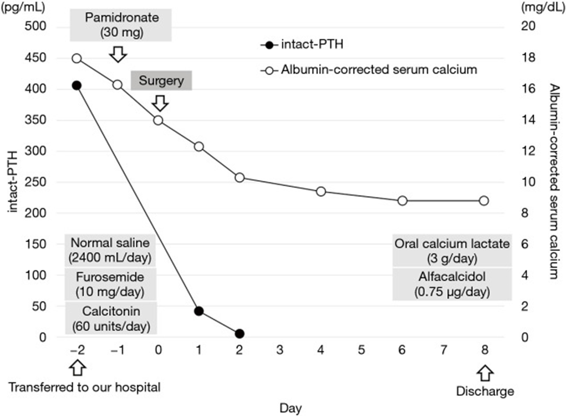 图 2:临床过程中白蛋白校正的血清钙 (mg/dL) 和完整 PTH (pg/mL) 水平。PTH,甲状旁腺激素。