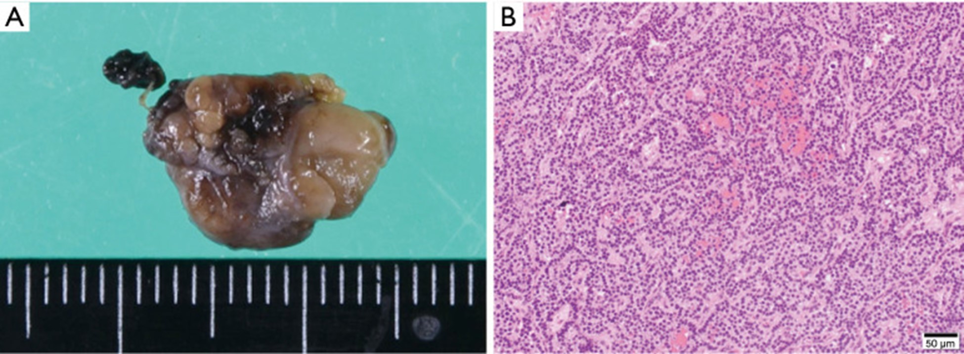 图 3:切除的甲状旁腺的大体外观(A)和组织病理学发现(B)。(A) 大小为 15×10 mm 的椭圆形块。(B) 主细胞增殖实性,无淋巴血管侵犯,与甲状旁腺腺瘤相符。HE ×20,比例尺,50 µm。