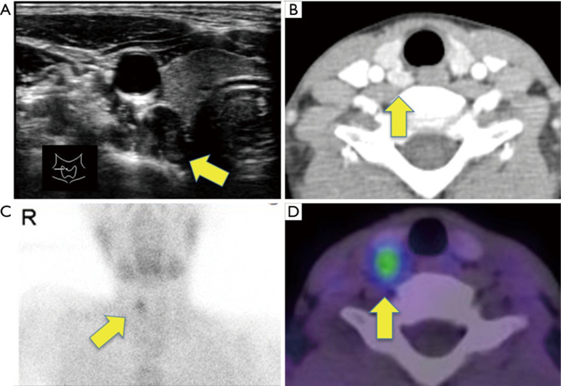 图1:超声 (A)、对比增强计算机断层扫描 (B) 和 Tc-99m sestamibi 闪烁显像 (C,D) 发现。(A,B)在甲状腺右叶上极后发现一个 15×9 毫米的肿块(箭头),提示右上甲状旁腺肿大。(C,D)Tc-99m sestamibi 在该肿瘤中被摄取(箭头)。