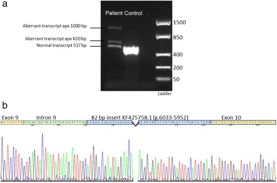 图 3:这个 ~6 kb 片段的测序证实了 6040 bp LINE-1 反转录转座子的存在,它被插入到内含子 9 ( a ) 中。PCR 分析证实未受影响的父母对于此插入是杂合的,而患者是纯合的 ( b )