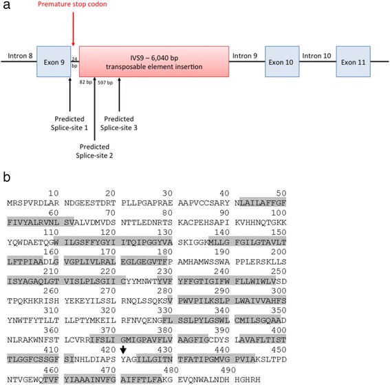 图 4:使用 NetGene2 和 ASSP 进行的剪接位点分析表明,在存在插入的情况下,除了出现在外显子内含子边界的正确剪接位点之外,插入中还存在另外两个剪接位点 ( a )。这些交替剪接事件导致移码突变,从而导致氨基酸 421 处的过早终止密码子,如箭头 ( b ) 所示。灰色阴影表示唾液酸蛋白的 12 个跨膜区域