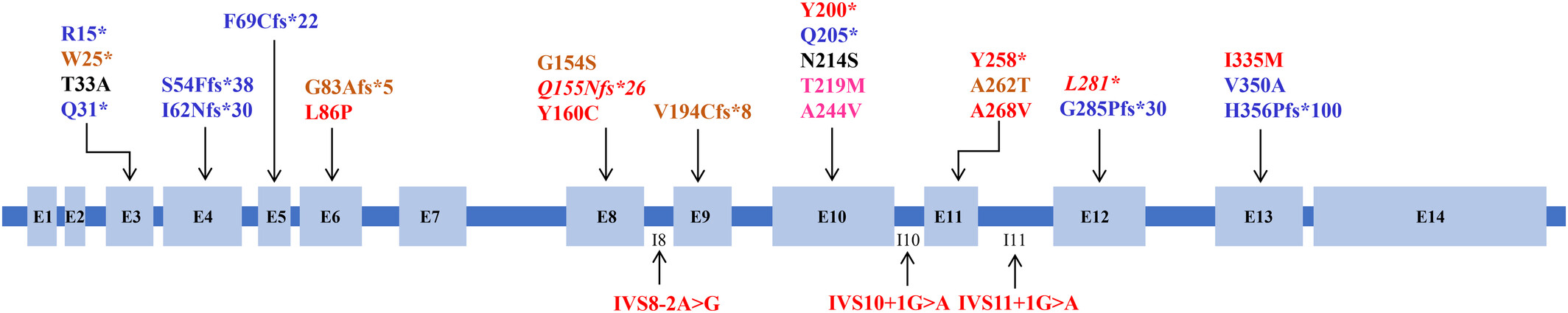 致病基因鉴定基因解码显示了HPD基因的内含子-外显子结构以及已经通过临床病例验证的致病性突变位点。本病例中的变异位点在外显子 10 内以紫色显示。其他与疾病相关的变异以红色显示,而杂合或不确定变异以棕色显示。ClinVar数据库中记录的与 酪氨酸血症III型 特异性相关的致病性或可能致病性变异以红色斜体表示,而其他变异则以蓝色显示。