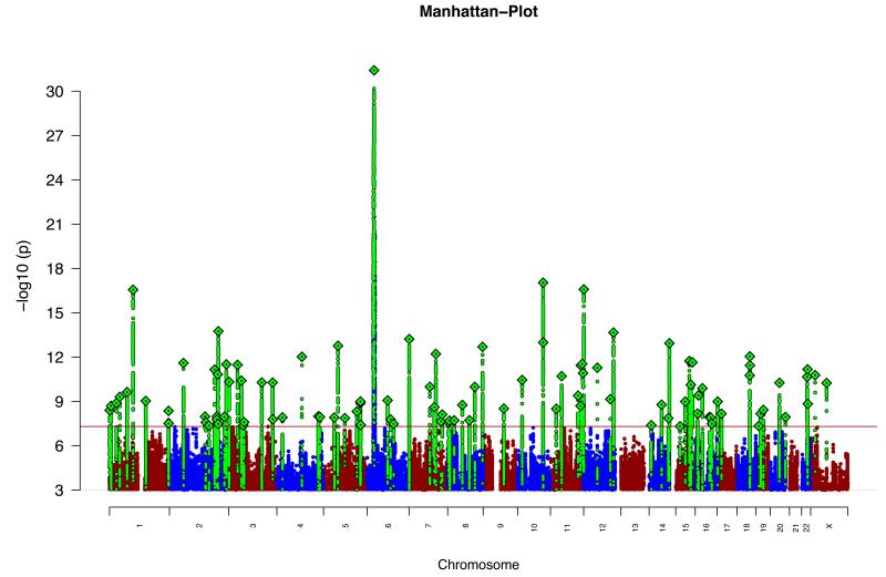 曼哈顿发现图——对49个病例对照样本(34241个病例和45604个对照)和3个基于家庭的关联研究(1235个受父母影响的后代三人组)进行全基因组关联荟萃分析。x-y轴是染色体的位置(−log10(P))。红线显示全基因组显著性水平(5×10)−8). 绿色的SNPs与代表独立的全基因组显著关联的指数SNPs(菱形)在LD中。