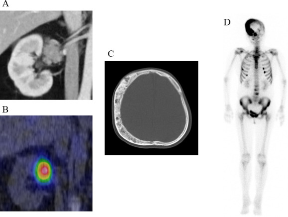 该患者的血压为 142/104 mmHg。体重51.7kg,身高154cm(体重指数21.8kg/m 2),左右握力分别为16.8kg和13.3kg。她有典型的月亮脸,有瘀点的中心性肥胖,四肢消瘦;然而,她没有其他类似库欣的特征,例如红色腹部条纹或水牛驼峰。双侧眼睑及下肢水肿;后者伴有皮下出血。体格检查显示,她的头盖骨右侧额顶区不对称变形,呈隆起;然而,没有观察到牛奶咖啡点。