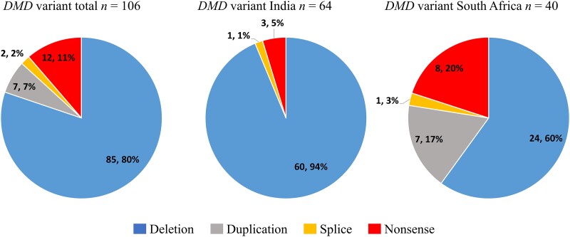 肌营养不良蛋白基因诊断率很高(98%),其中 MLPA 和 WES 分别贡献了 86% 和 14% 的诊断。与之前的研究一致,缺失和重复贼为常见(87% 的参与者已解决)。印度和南非队列之间的比较发现,DMD 基因内两种类型的遗传变异(缺失、重复、无义、剪接变体)及其分布(包括内含子断点)存在差异。南非队列显示出更多的重复和无义突变,以及基因近端 5′ 端内含子断点比例更高。这可能是由于队列规模的差异和患者招募的差异(例如通过 MLPA 本地解决的患者与未解决的患者)造成的,然而据报道,南非人群中大量缺失的比例相对较低。探究这一观察结果的原因非常重要,因为它可能对外显子跳跃疗法的适用性有影响。