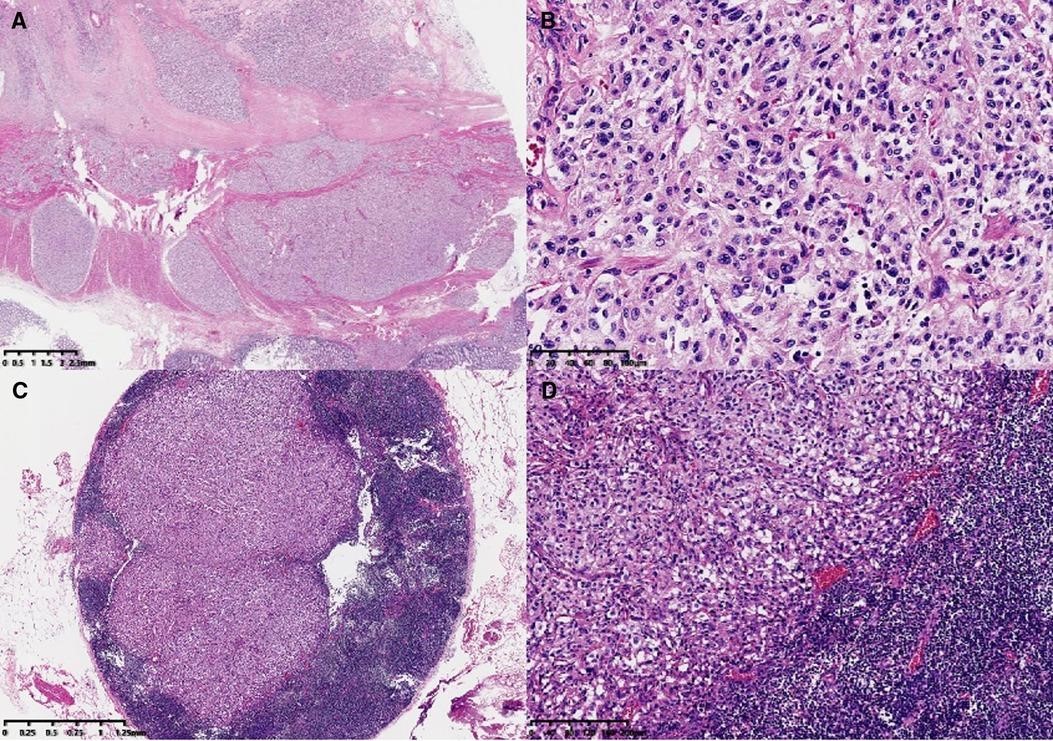 图 1。微观特征。肿瘤主体位于结肠壁肌层和浆膜下层(A,×6)。高倍镜下,肿瘤形态呈巢状、器官样结构(Zellballen型)(B,×200)。淋巴结转移(C,×20;D,×100)。