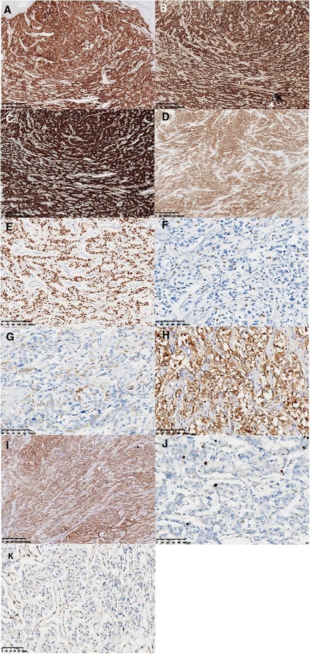 图 2:免疫组化染色结果。神经内分泌标志物:CD56、ChrA、Syno 和 NSE 呈弥漫性强阳性表达(A,×40;B,×40;C,×40;D,×40)。GATA3呈弥漫性核阳性(E,×100)。支持细胞通过 SOX10、GFAP 和 S-100 免疫染色(F,×200;G,×200;H,×200)突出显示。MelanA 表现出弥漫性中度表达(I,×40)。Ki-67 标记指数约为 5% ( J , ×200)。SDHB呈阴性表达(K,×200)。